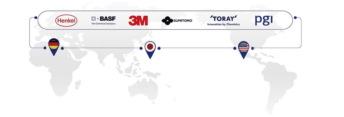 INCHING has partnered with several leading material suppliers including Japanese SAP producer Sumitomo, American company Weyerhaeuser, German SAP producer BASF, USA company 3M, German Henkel and other global top 500 companies.